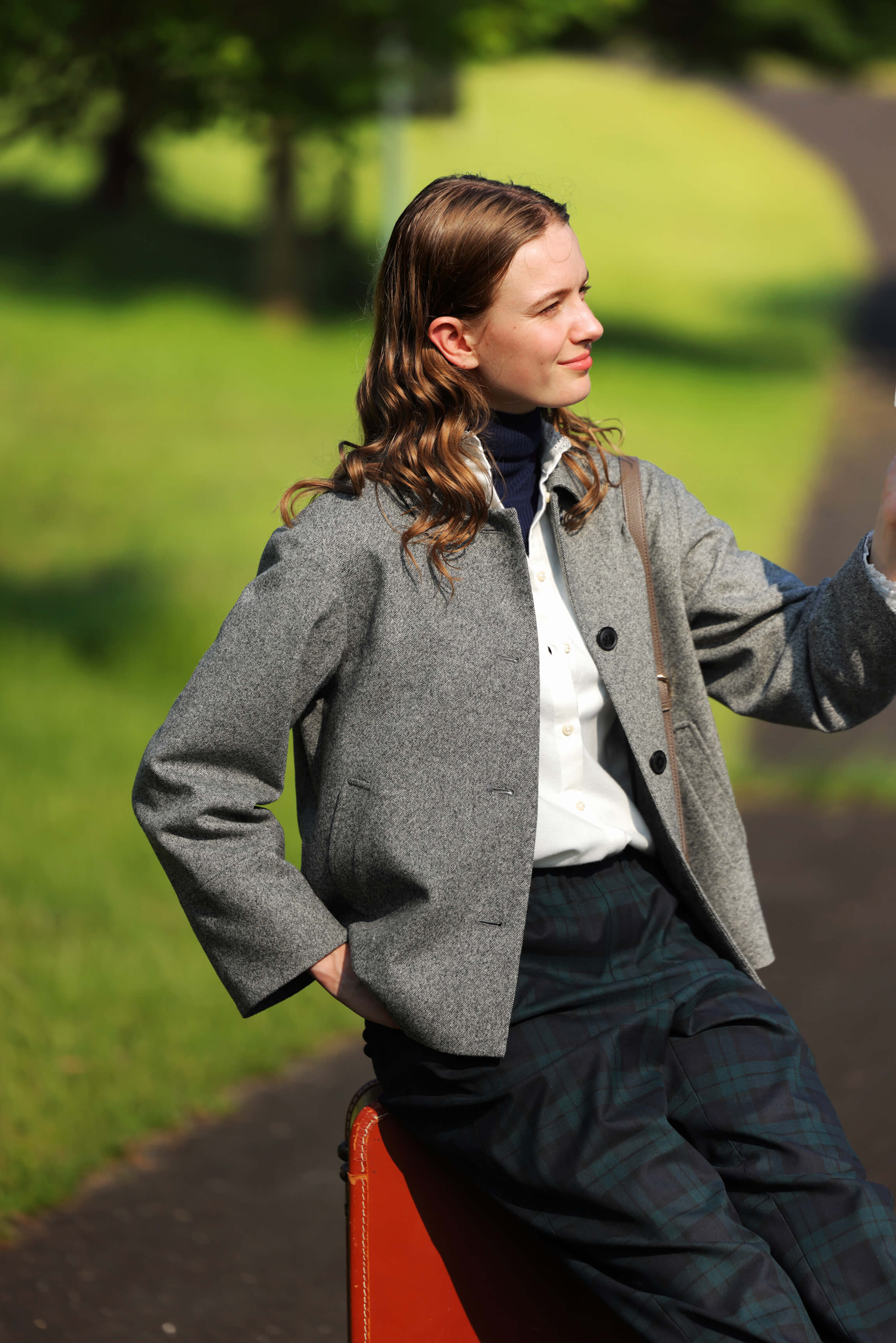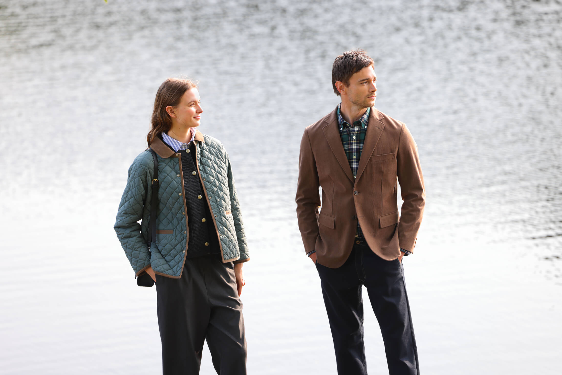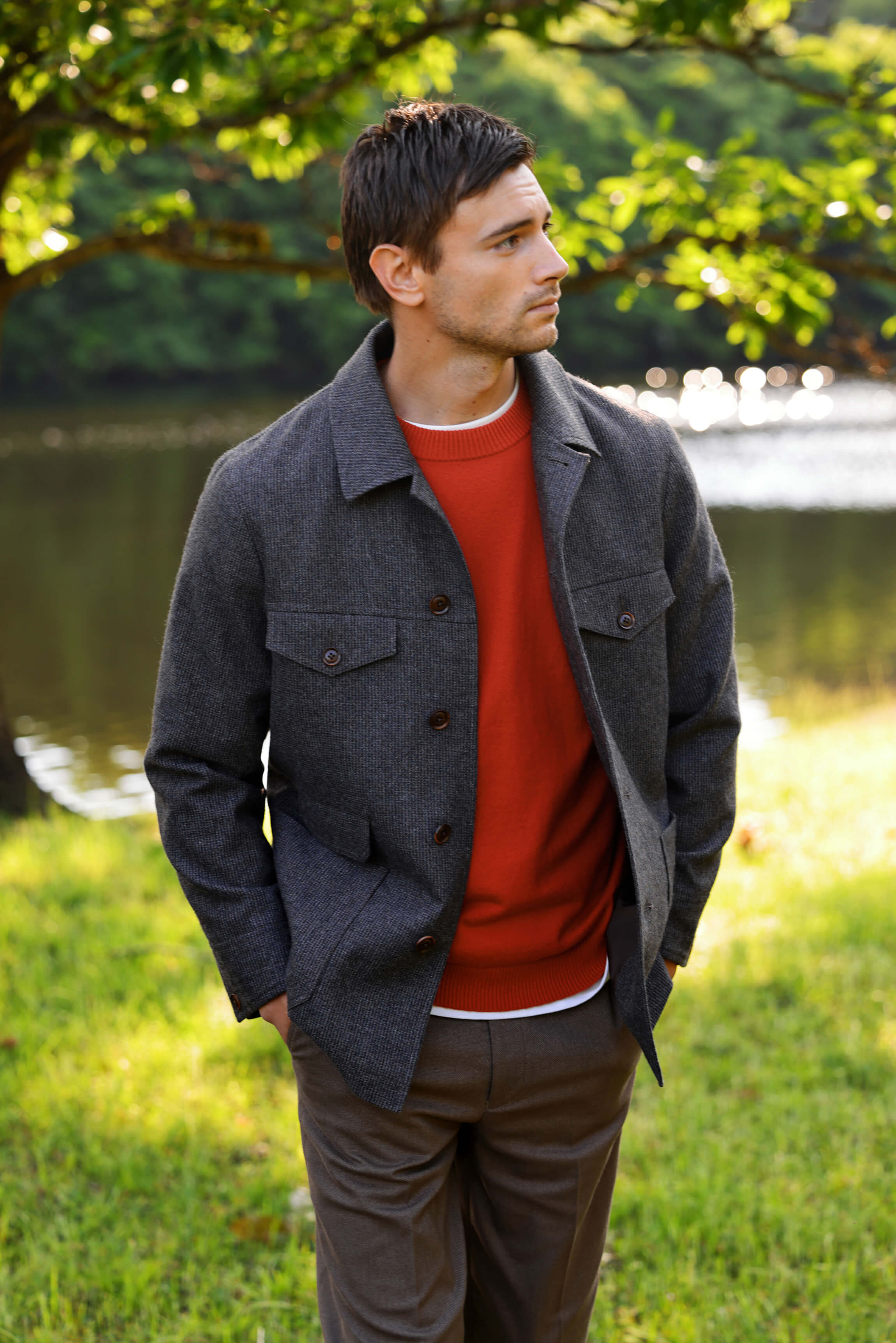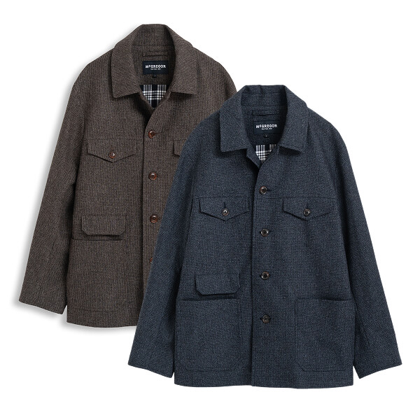 英国調アウトドアカントリージャケットをイメージしたアウターは、ウールと綿をブレンドしたソフトな手触り。伝統的な千鳥格子をこなれたネップと秋色カントリー配色で着こなしやすい柄にアップデート。