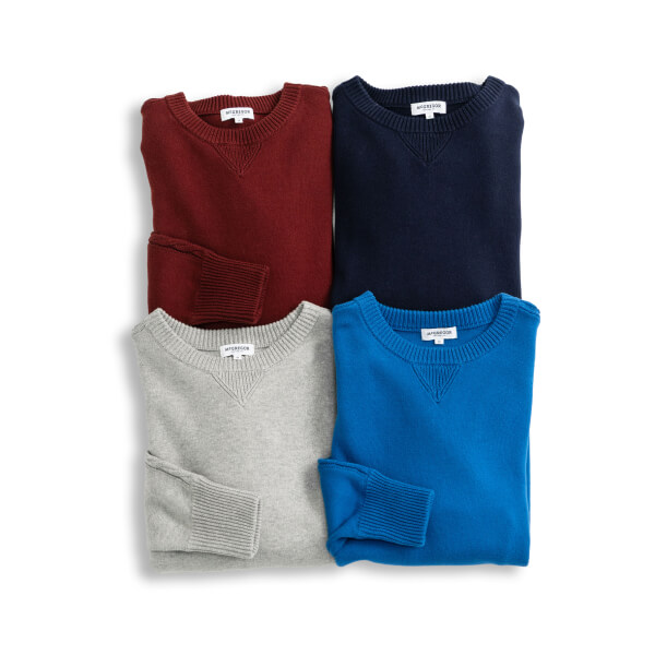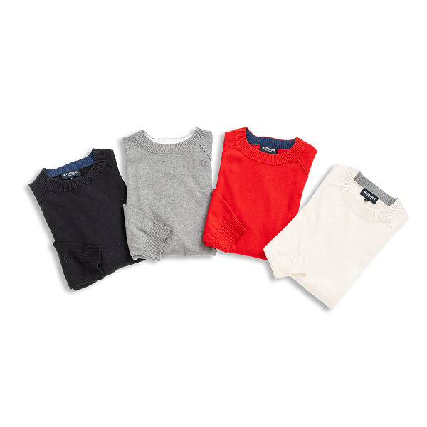 綿にウールをブレンドした糸を使用し、柔らかくもっちりとした肌触りのニット。鹿の子編みで編まれたシンプルなデザインとラグランショルダーや襟裏の配色がスポーティで遊び心のあるデザインが特徴。