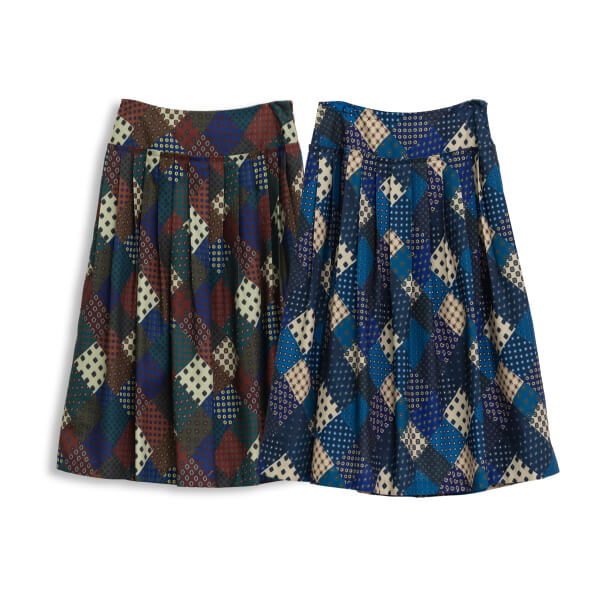 様々な小紋柄を散りばめたパッチワーク風プリントで、ブリティッシュ感漂う印象のプリントスカート。裾にかけてプリーツが自然に消えるソフトでしなやかな動きのあるデザイン。