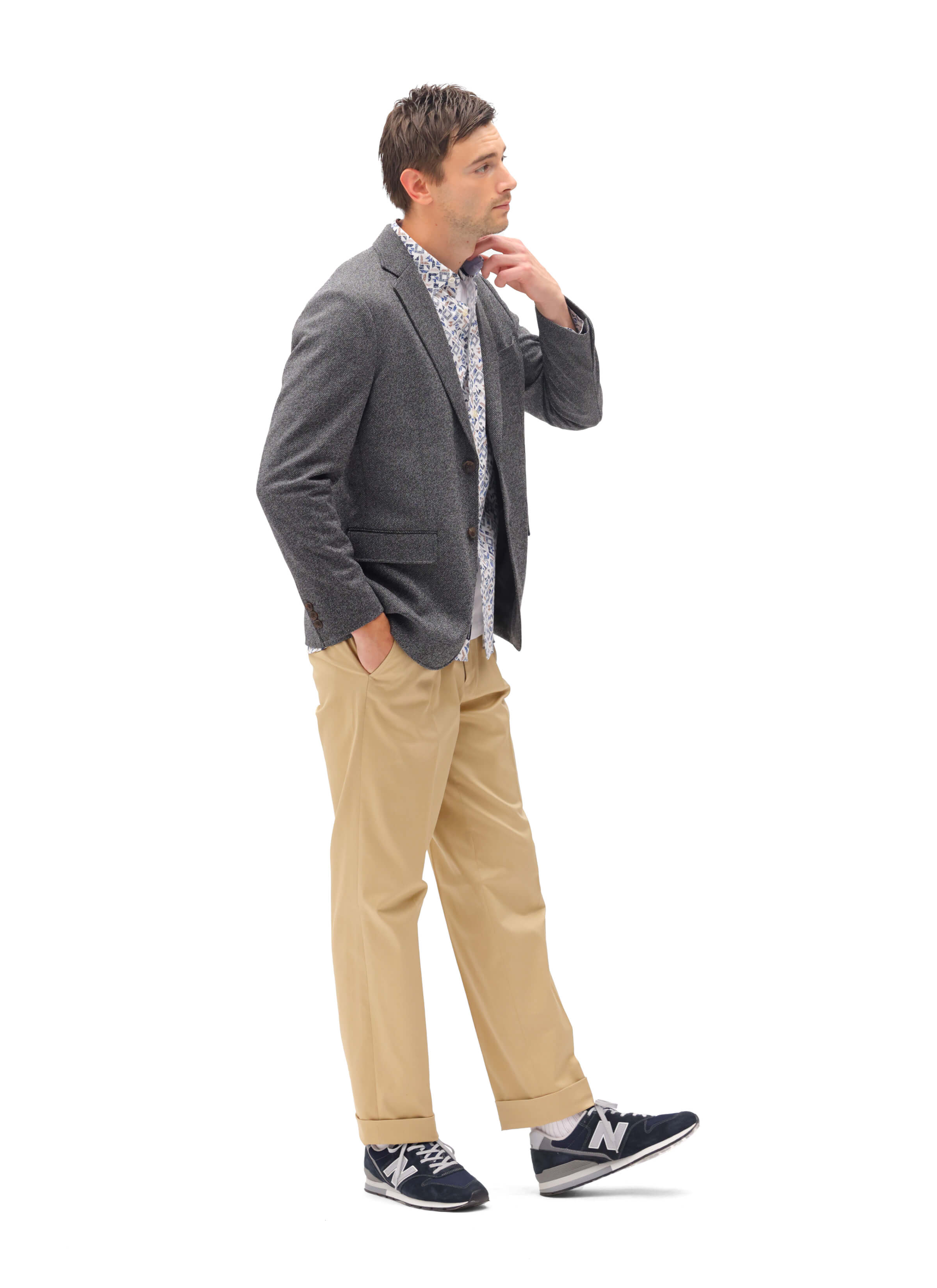 ウールライクな見え方が特徴のサラリとした風合い、防シワ性に優れた素材を使用。メランジ感のある千鳥柄は、きれい目カジュアルからビジネスまで、幅広いコーディネートを楽しめる。 襟立て時はフラワープリントがアクセントに。