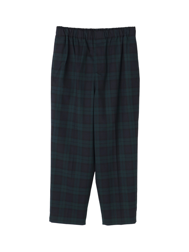 着用感が快適なリラクシングウェスト仕様のきれい目なスラックスシルエットのノータックパンツ。ソフトで優しい風合いと保温機能を持つストレッチ素材を使用し、今季は英国ムードのあるグレンチェックも展開。