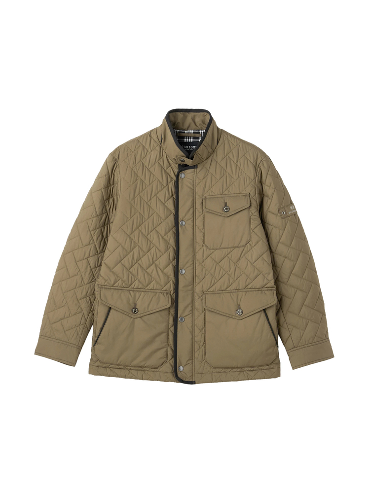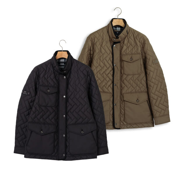 特徴ある凝ったキルトパターンをあしらった都会的なキルティングアウターは、ソフトなポリエステル素材を使用。ニットを合わせて都会で過ごすホーリームードを楽しみたい。