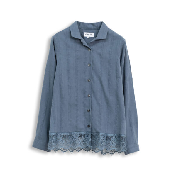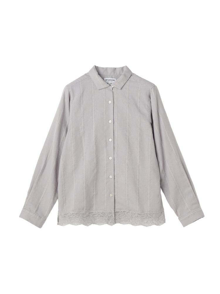 表面感のあるドビー素材に、レースをドッキングしたニュアンス感のあるブラウス。コンパクトなワンナップカラーが、優しい雰囲気。1枚着としてはもちろん、ニットやカットソーのインナーとしてもおすすめ。様々な着こなしを楽しみたい。