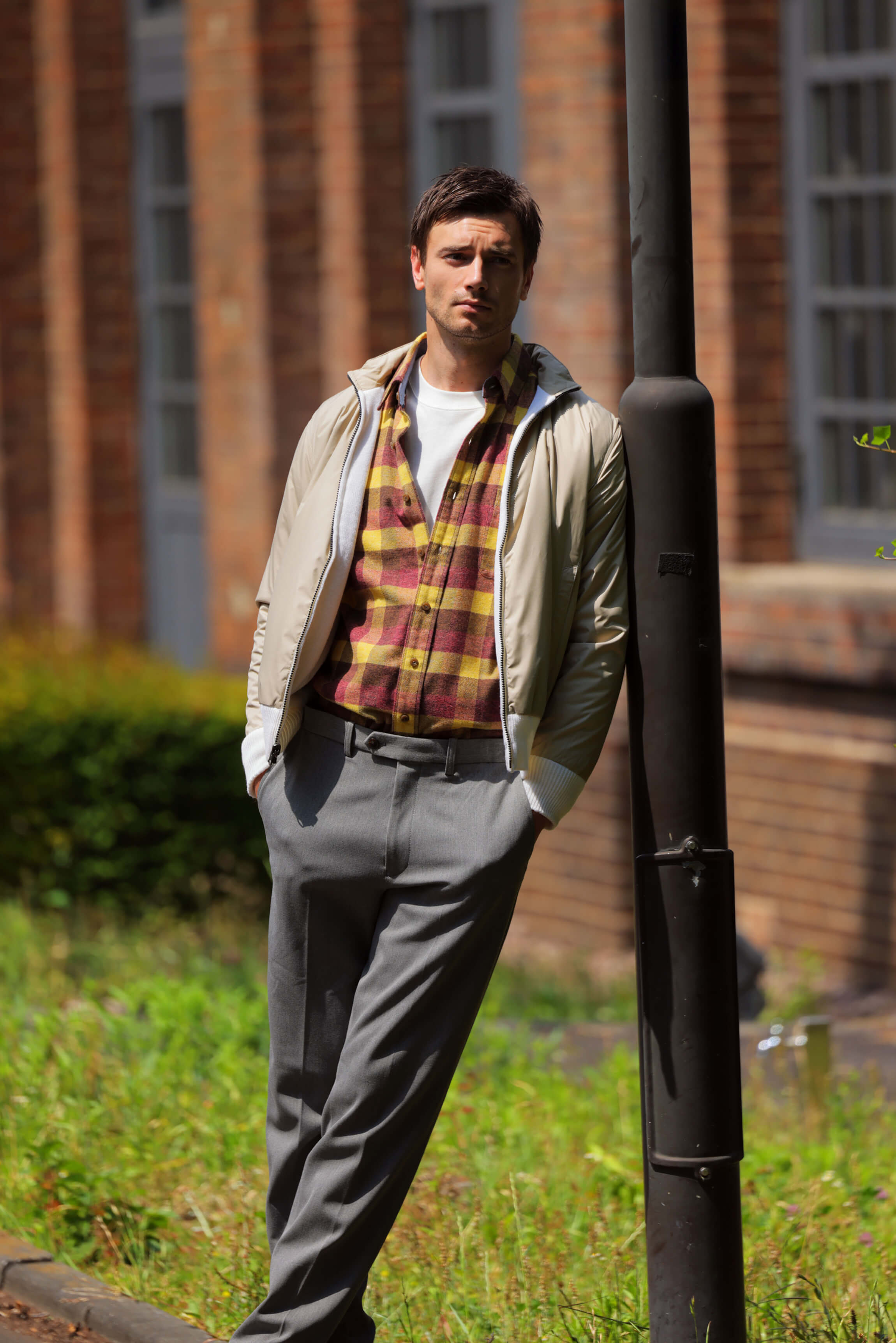 チェック柄が目を惹くニットジャケットは、表情のある編地が特徴。襟元や前立ての配色が、全体をまとめて大人な印象に。