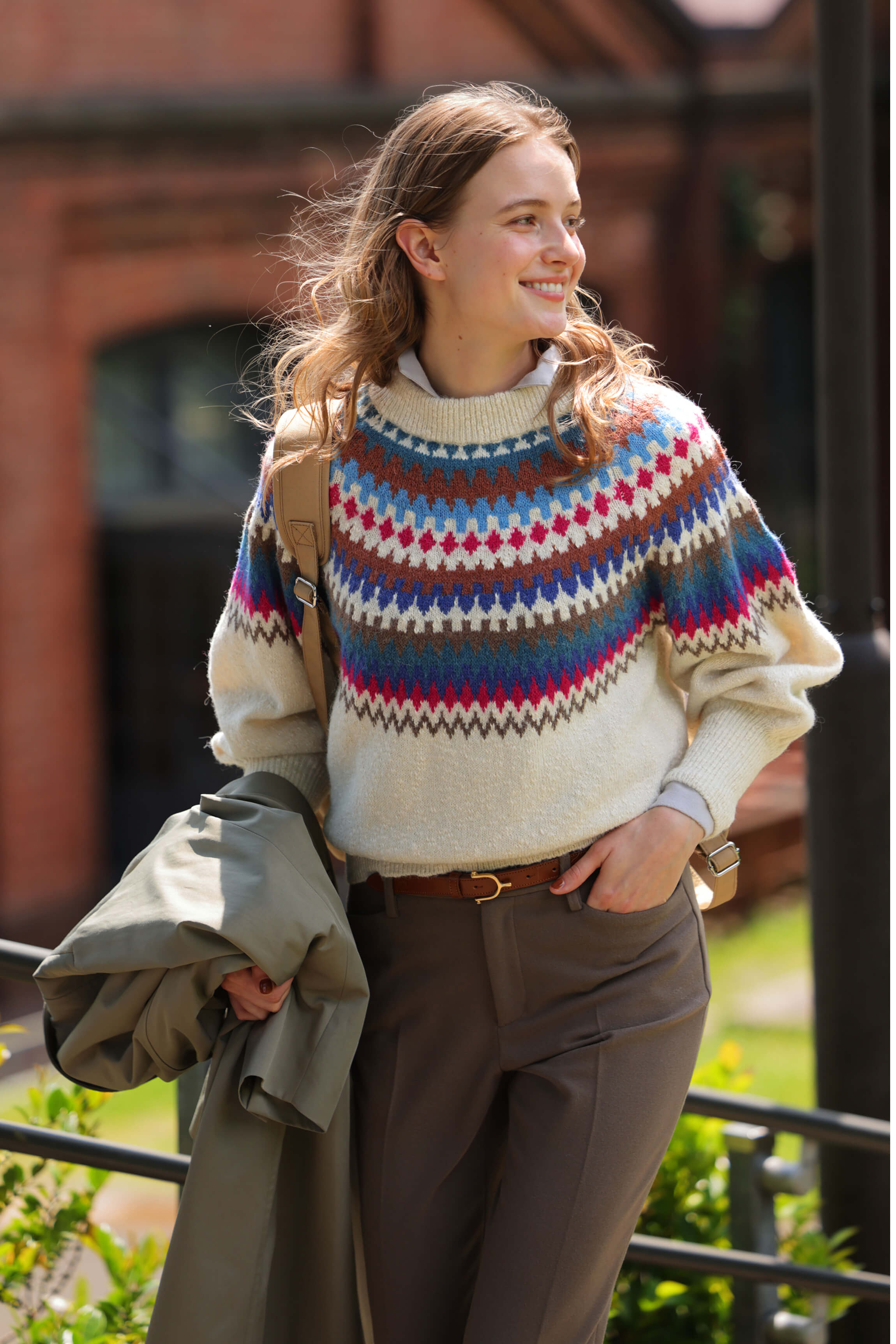 ニットを合わせて都会で過ごす