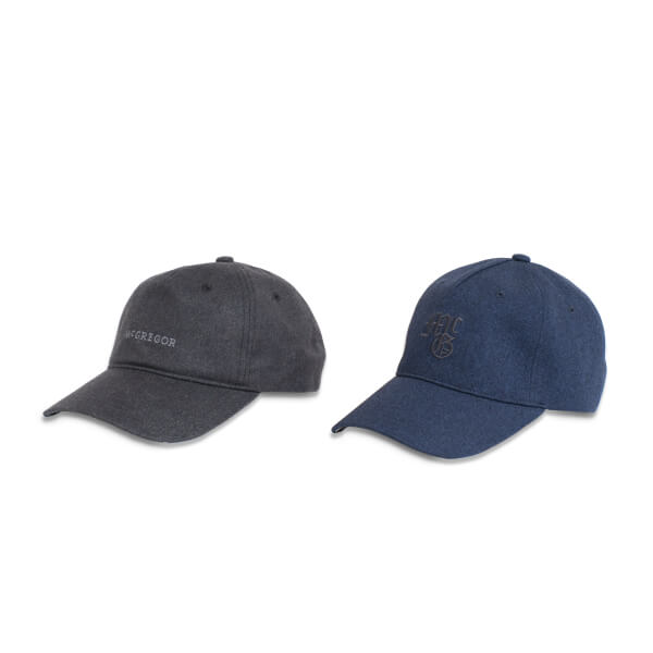 左)撥水・防風・透湿性に優れた機能素材「McG TECHNO」を使用した機能キャップ。  右)ウールライクな素材とシックな配色のモノグラムモチーフが特徴的。