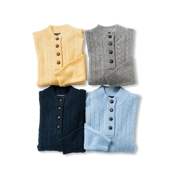 前身頃はオーセンティックなケーブル編みで、前立てには革くるみ風ボタンを使用したクラシカルなデザインニット。オーストラリアのジーロングで採れる上質なラムウールで編み上げた柔らかくて肌ざわりの良い素材が特徴。