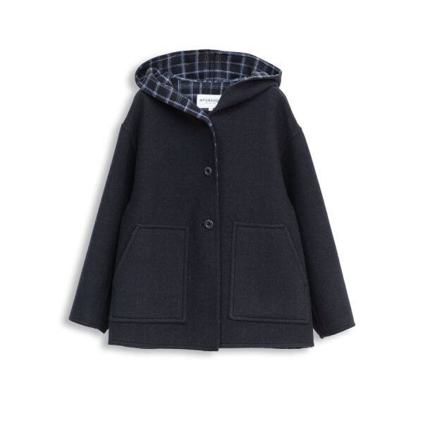 上質なウール特有の厚みと軽さが備わったダブルフェイス素材のショートコート。ヒップが隠れるくらいのショートレングスで、ワイドなボリュームがポ イント。大人カジュアルを演出したパッチポケットは、上質さと愛らしさのバランスが絶妙。フードか ら覗く裏面の配色もデザインのアクセント。