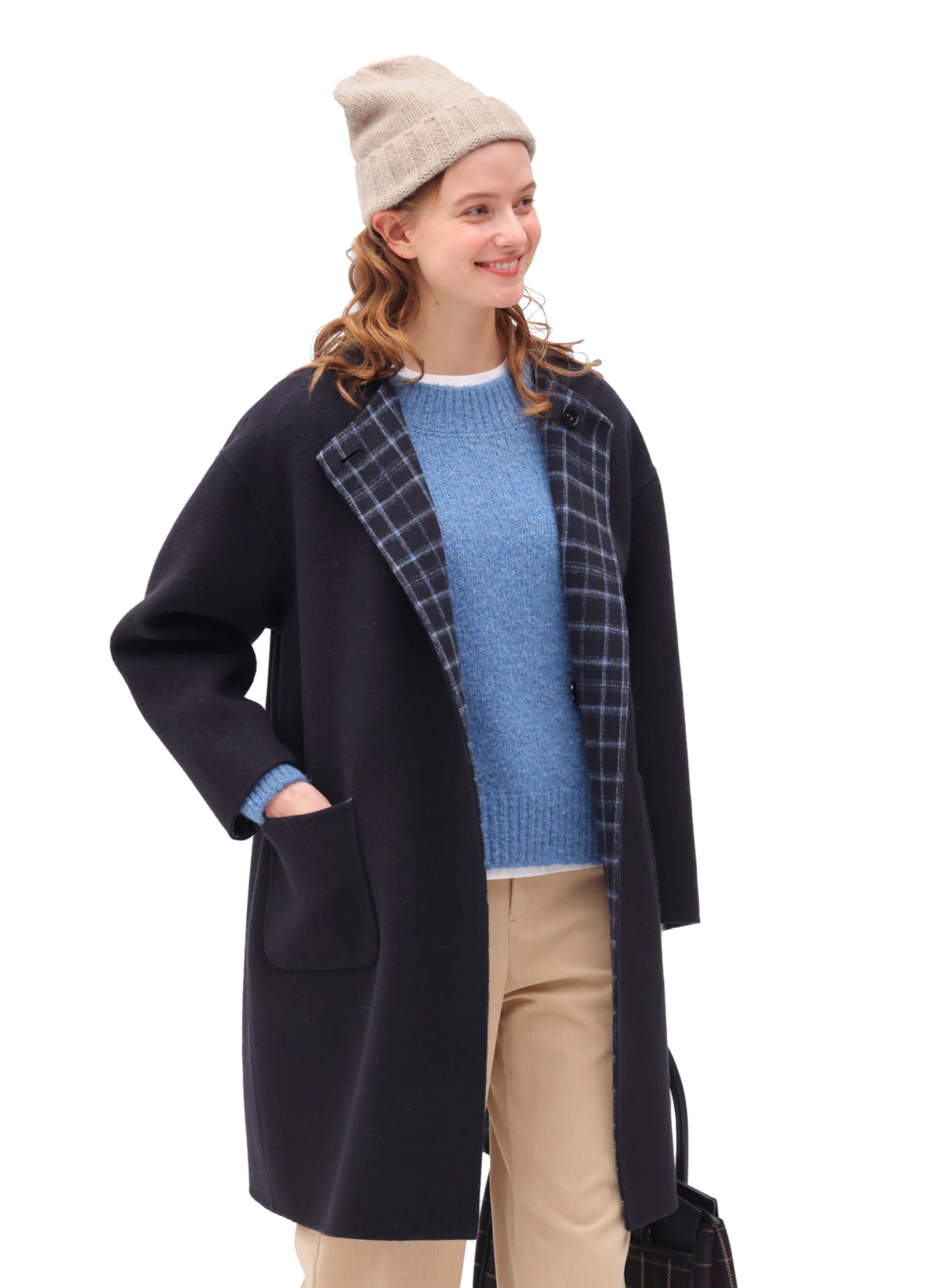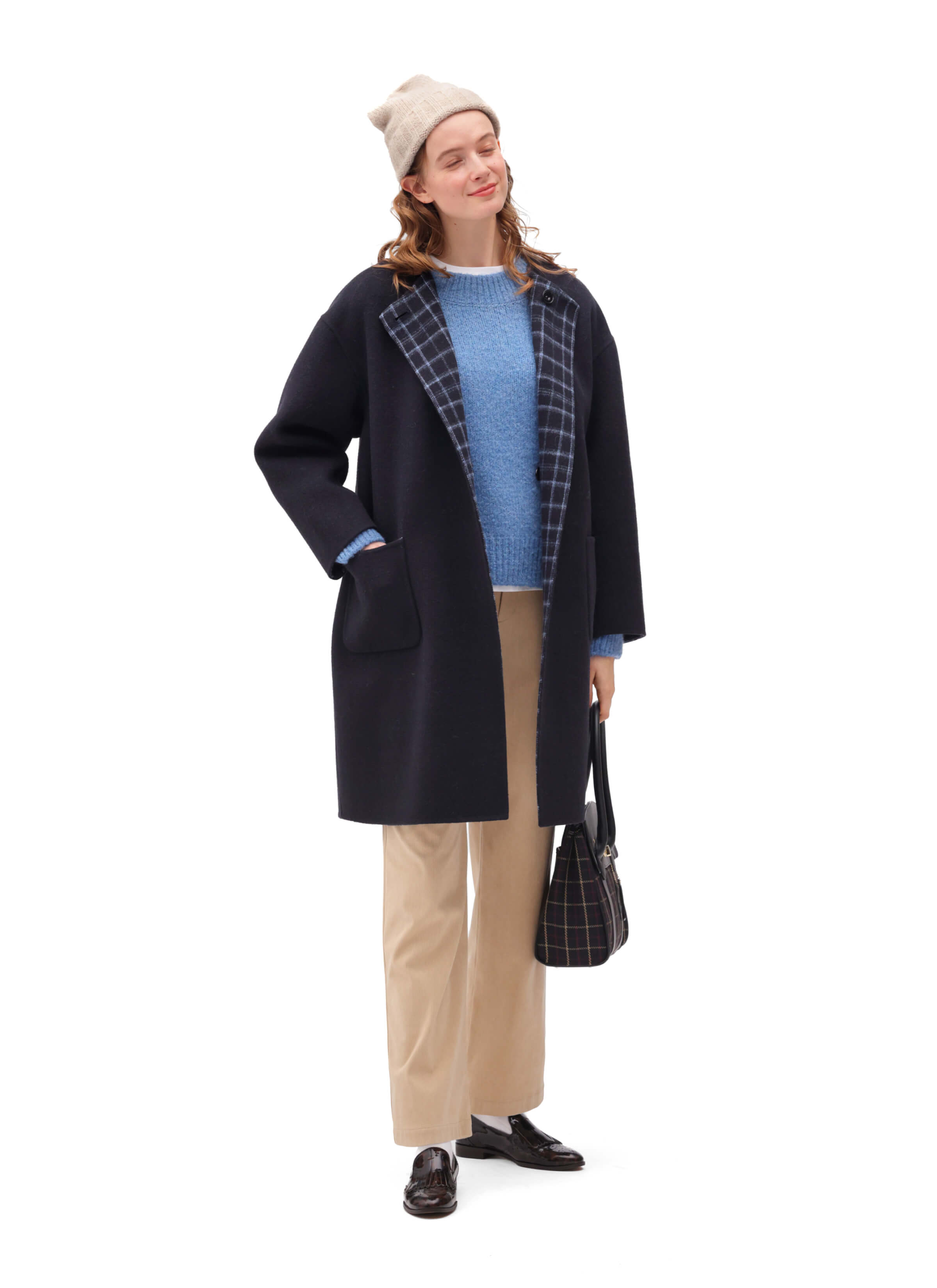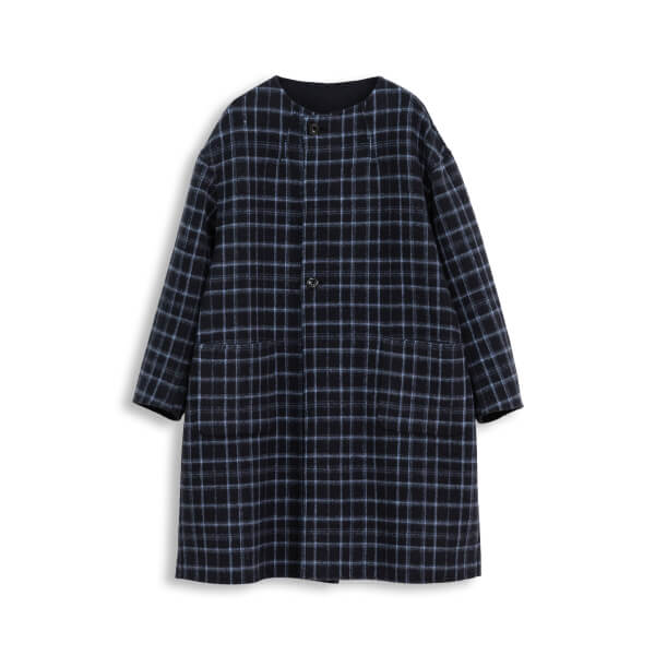 上質なウール素材のWフェイスリバーシブルコート。表面は無地、裏面はチェックで異なる表情を楽しめる。きちんと感のあるノーカラーデザインは、ON/OFF問わず活躍するアイテム。