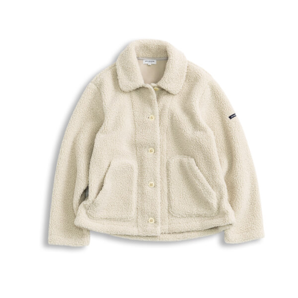 襟付きにすることできれい目にも合わせやすいボアジャケット。表地がボア、裏がフリースのボンディング素材は、程よい厚みで暖かい。袖のピスネームがスポーティなアクセントで、コーディネートの主役になるアイテム。