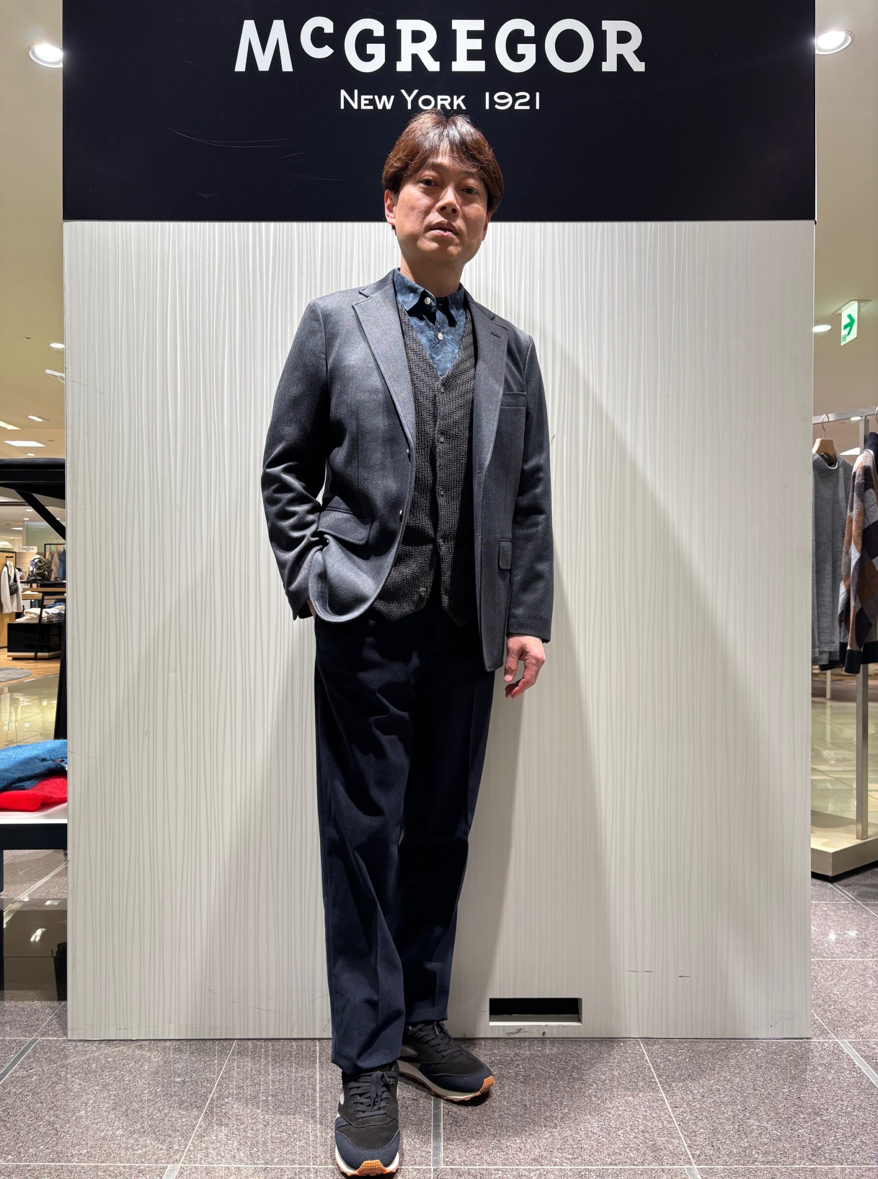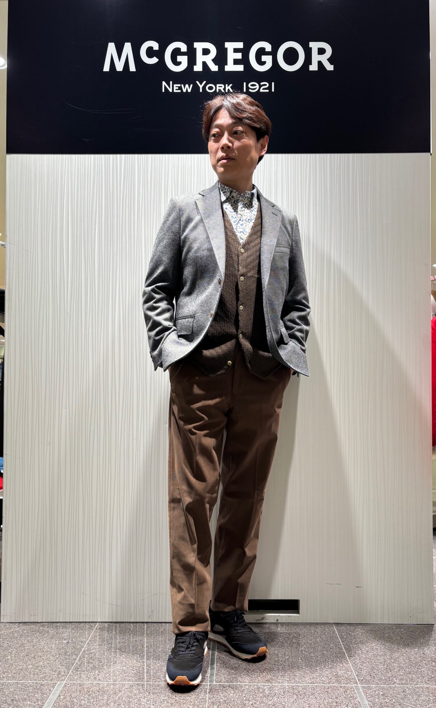 肌寒い季節に対応したジャケットとベストのスタイリングです。