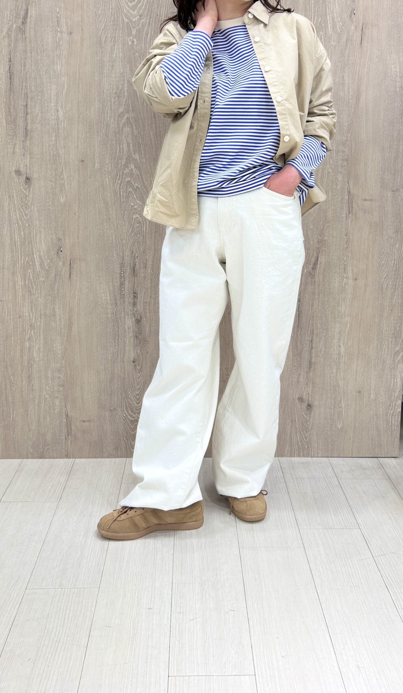 ボーダーカットソーはベージュカラーのシャツのインナーに合わせるのもおすすめです!