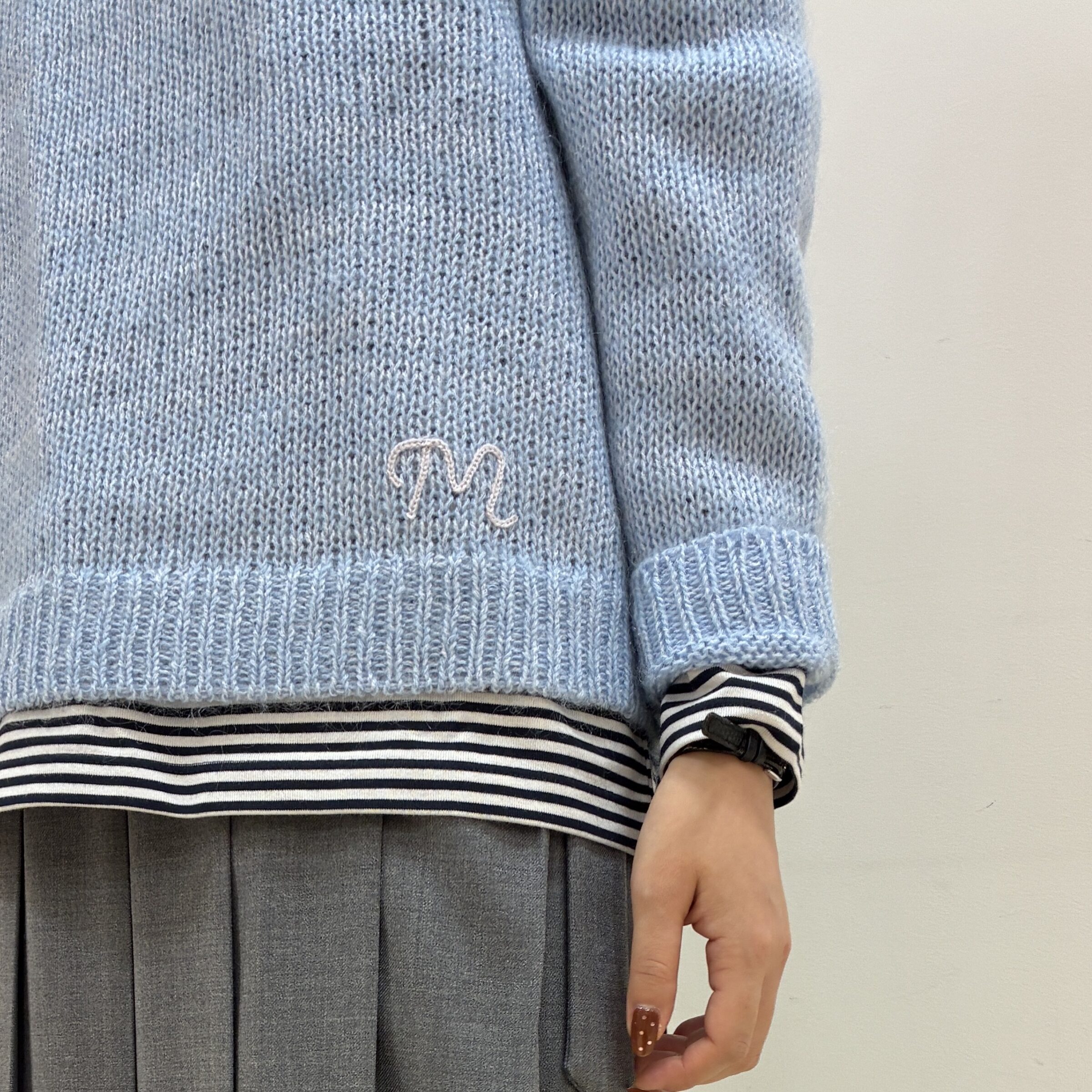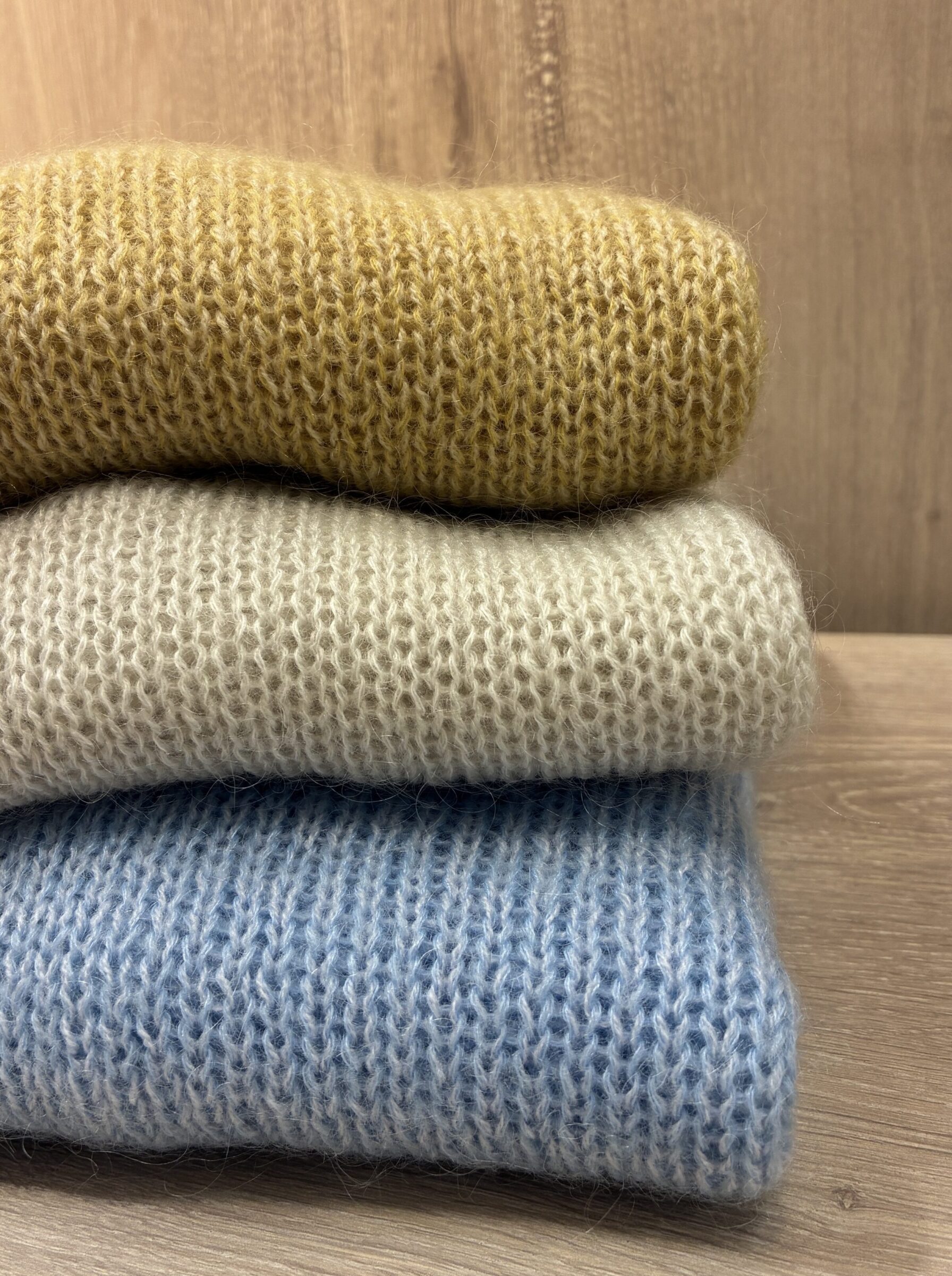 モヘア混の起毛感がある素材に、アクリルウール糸を引きそろえ、程よい透け感の編地に仕上げています。