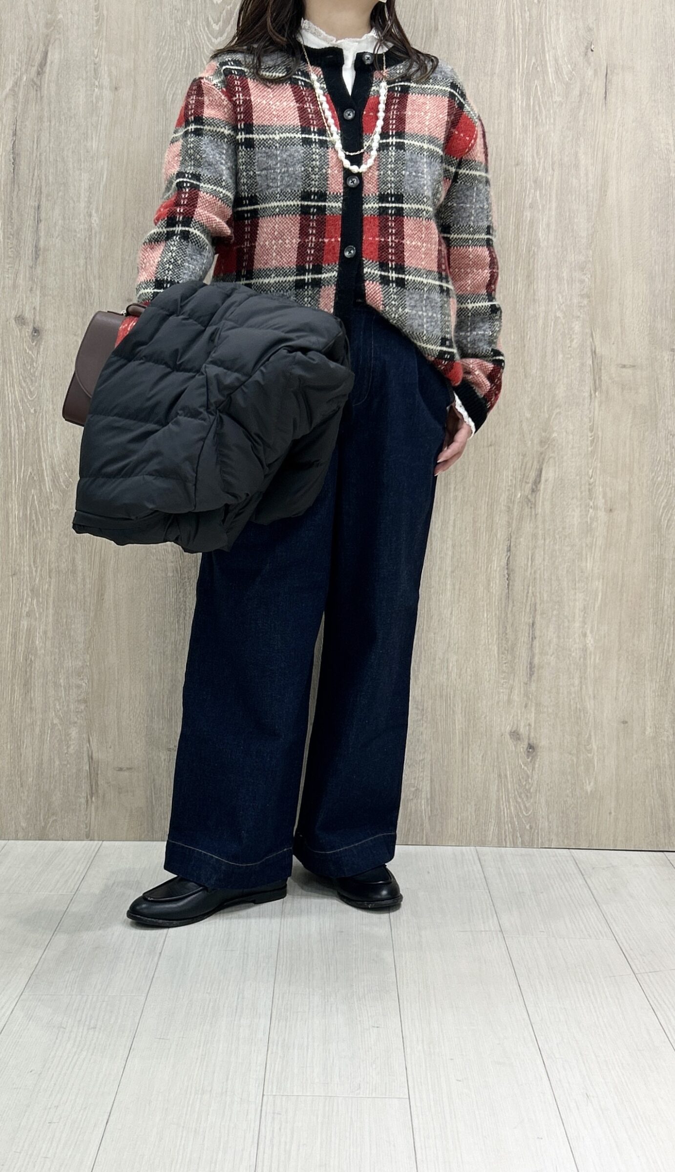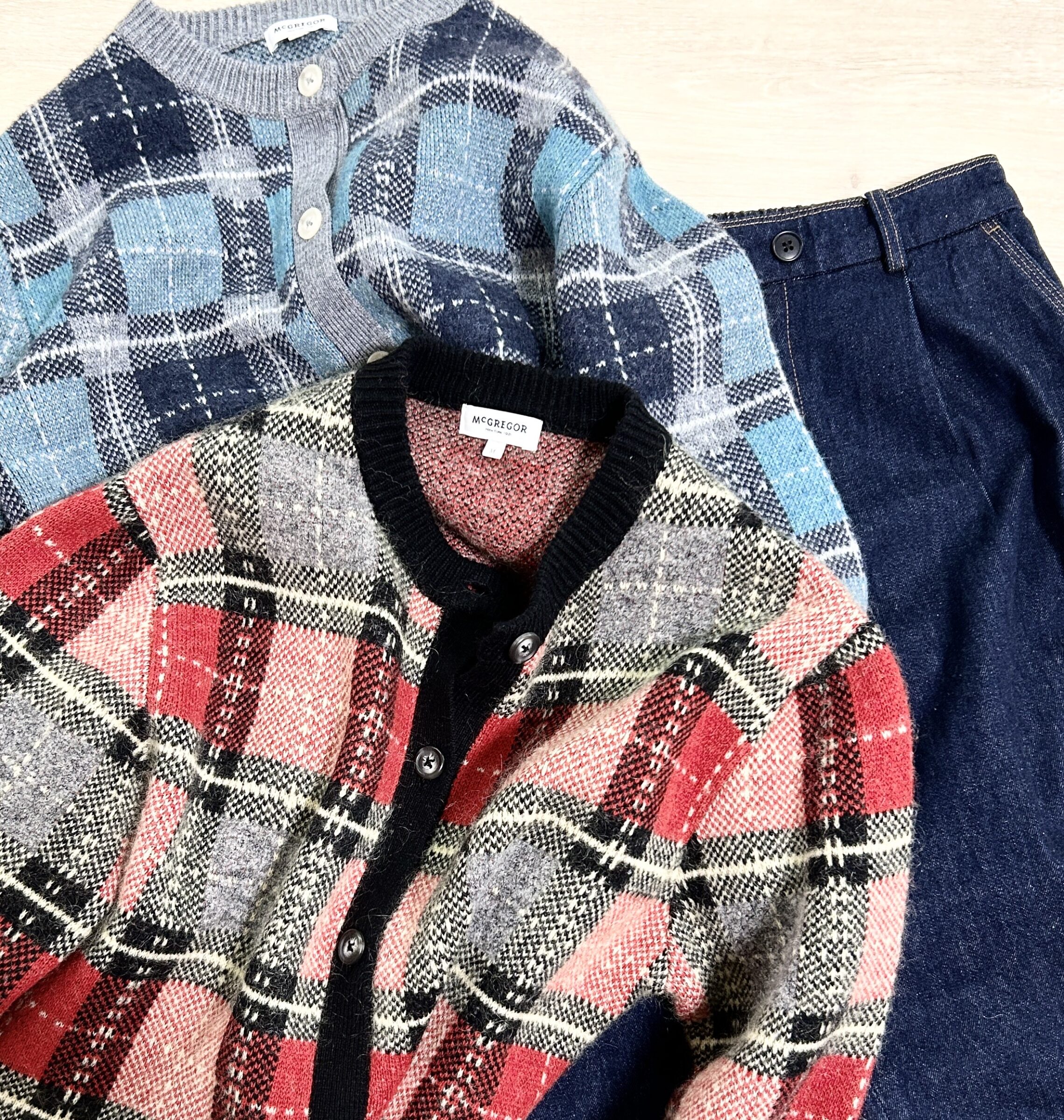 この時期の気分をさりげなく盛り上げてくれるタータンチェック柄のニットジャケットを主役に、