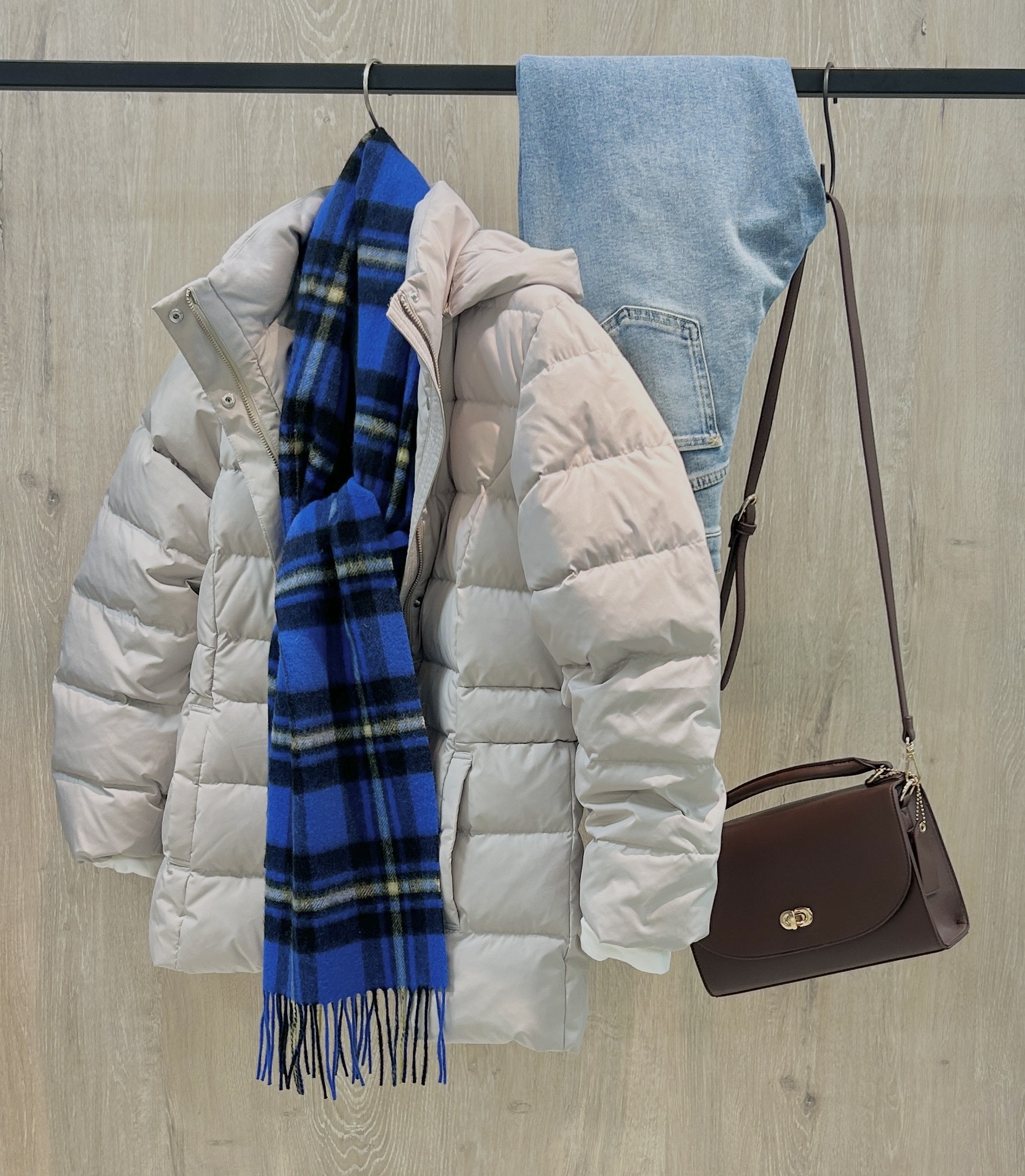 手に持ったダウンは、明るいベージュカラーの展開もあり、すっきりシルエットのミドル丈です。