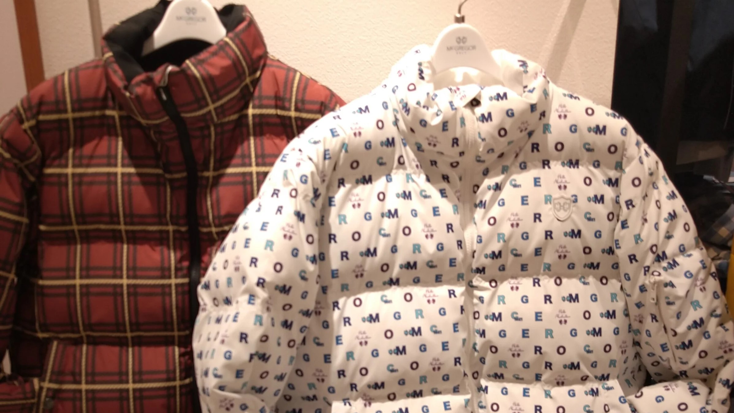 手に持ったダウンは、明るいベージュカラーの展開もあり、すっきりシルエットのミドル丈です。