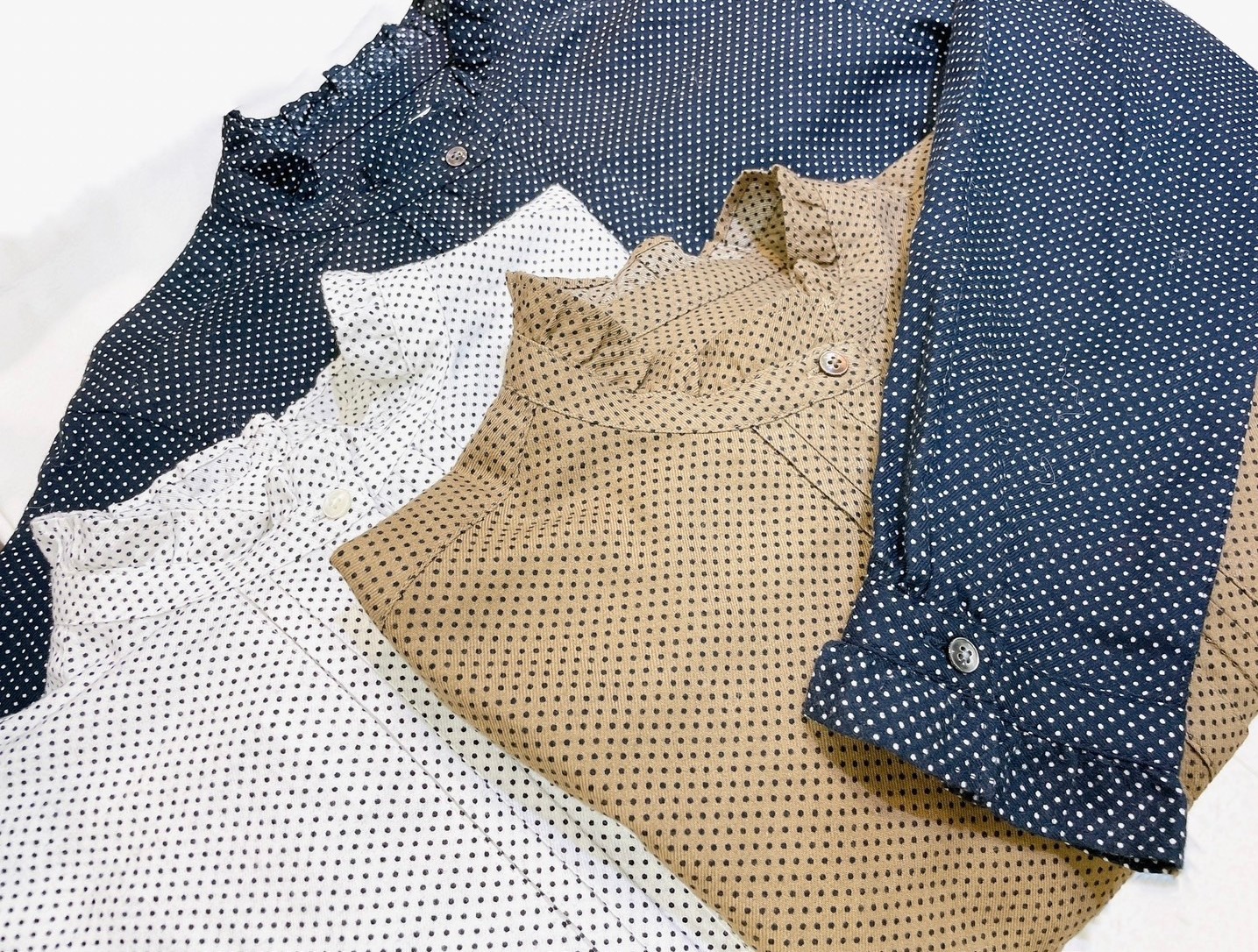ブラウスはソフトな肌触りの起毛素材にシンプルなドットをプリント。