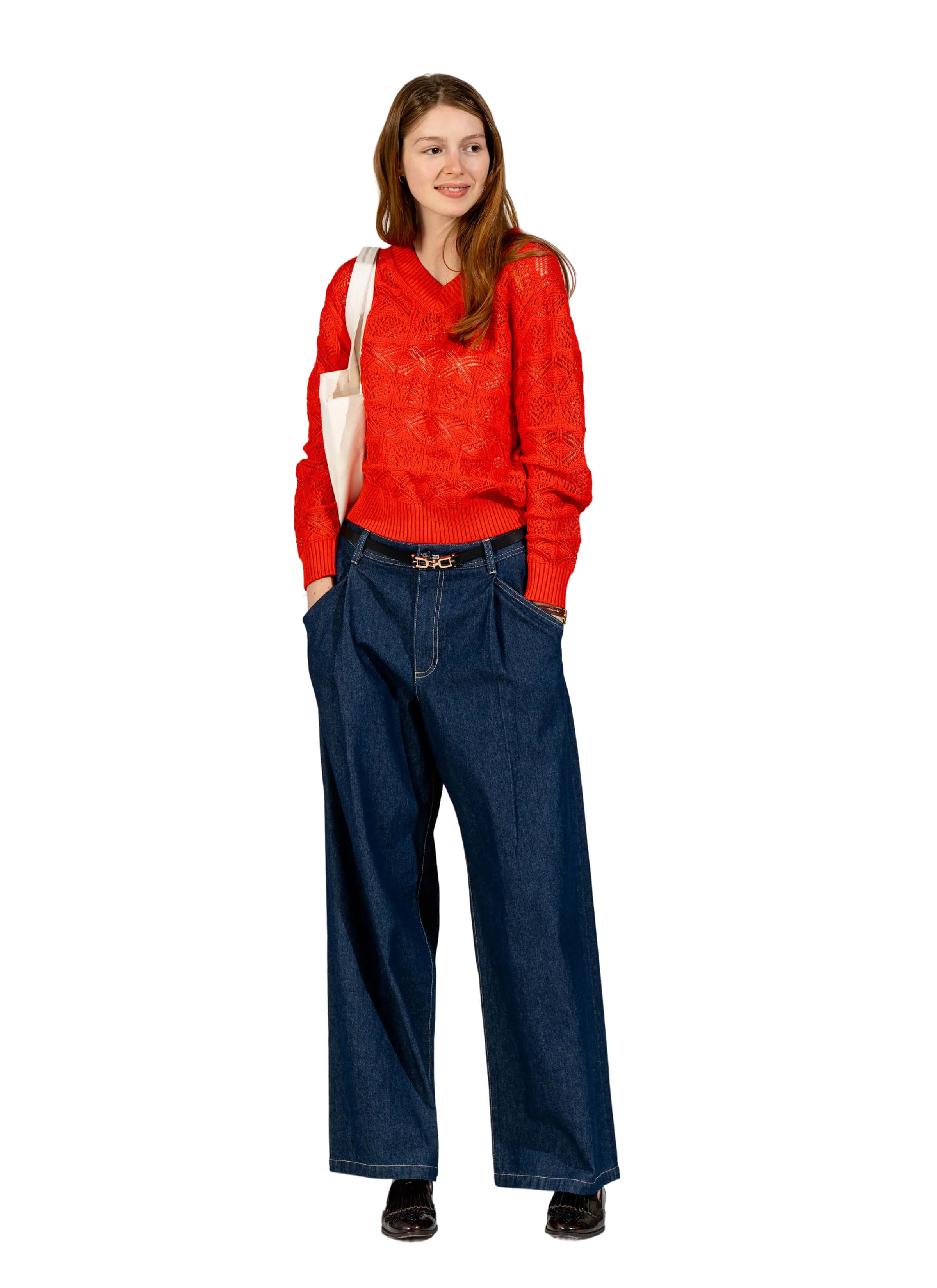ビビッドなオレンジが目を惹くニットプルオーバー。